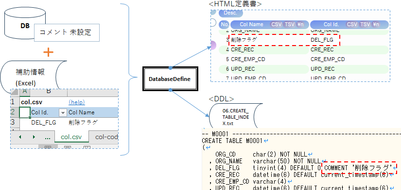 コメント情報が登録されていないDBでも、補助情報(Excel)を設定すれば論理名に日本語を設定することは可能です。また、補助情報で論理名を設定していれば、当ツールで、コメントに論理名を設定するDDLを生成することが可能です。